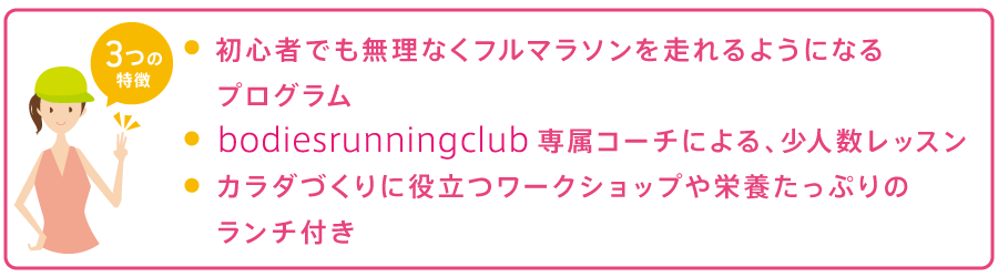 女性のためのランニングクラブ・bodies running clubの、初心者でも無理なくフルマラソンを走れるようになるオリジナルプログラム。